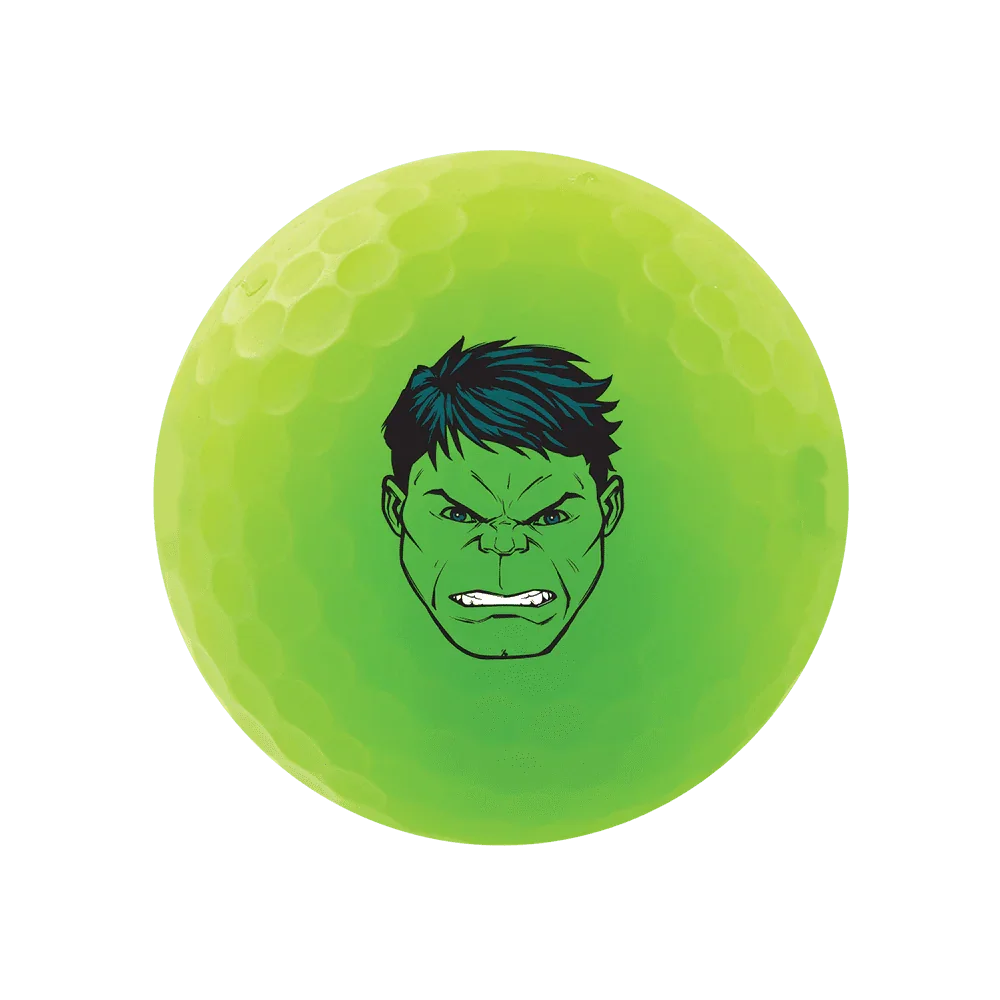 Golf ball featuring Hulk design elements. New oversized core maximizes distance for players hitting the ball at 70-90mph head speeds. Three-piece construction, ionomer cover, 322 dimples. 75 compression